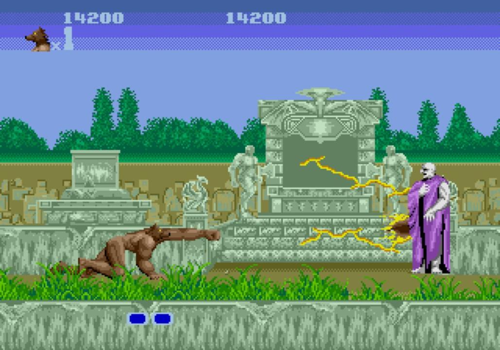 A Roman centurion who had died in battle is resurrected from the dead by Zeus. The centurion is ordered by Zeus to save his daughter Athena from a Demon God called Neff in the Underworld. To become able to withstand the perils, the warrior gets the ability to absorb spirit balls which transform him into an Altered Beast, a part animal, part human creature of formidable force. Between each level are small animations giving the player glimpses of Athena's peril. He first travels through the graveyard fighting past zombies and winged demons. The centurion becomes a werewolf in order to fight Neff in the form of Aggar. The centurion defeats him, but Neff escapes. The centurion travels through the Underworld where he fights through giant leeches, Chinese dragon-headed rattlesnakes, and ferocious Chicken Stingers (resembling the ones from Golden Axe). The centurion turns into a humanoid thunder dragon in order to fight Neff in the form of Octeyes. The centurion defeats him, but Neff escapes. The centurion travels through the Cavern of Souls where he fights through Cave Needles (which resemble giant ants), turtle/snail hybrids, and zombies known as Grave Masters. The centurion turns into a humanoid bear in order to fight Neff in the form of Mouldy Snail. The centurion defeats him, but Neff escapes. The centurion arrives at Neff's palace where he fights through zombies, Chicken Stingers, and Hammer Demons. The centurion turns into a humanoid tiger in order to fight Neff in the form of Crocodile Worm. The centurion defeats him, but Neff escapes. After the centurion arrives in Dis, he fights through winged demons, Goat Men, Boar Men, saw fishes, and purple Unicorn Men to get to Neff. When the centurion confronts Neff, the centurion becomes a golden werewolf while Neff transforms into a Rhinoceros-Man. After he is defeated, a blue bird comes out of the ground and transforms back to Athena. Afterwards she is shown holding arms with her lycanthropic hero, thanking him for rescuing her. In the original arcade, the end credits are interspersed with images of actors in costumes for the different characters and monsters of the game, implying the whole game was a film production.[2]