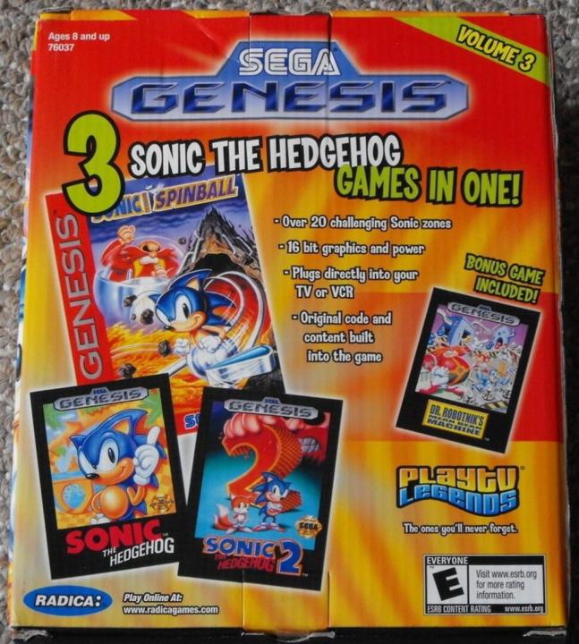 Arcade Legends: Sega Genesis Volume 3 is a game console which is part of the Play TV Legends series. There is no cartridge port but four games are available which include: Sonic the Hedgehog, Sonic the Hedgehog 2, Sonic Spinball, and Dr. Robotnik's Mean Bean Machine.