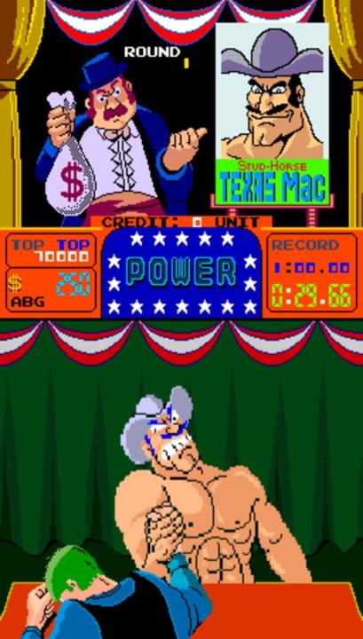 The player faces off against a beefy Texan, a Sumo, a masked fighter, a robot, and a mutant in a series of arm-wrestling contests. Timing and quick joystick motions are key to victory.