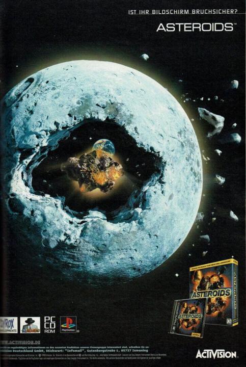 Unlike Activision's earlier remake of an Atari arcade classic, Battlezone, this one stays close to its namesake. Take the original, Atari coin-op game Asteroids, add in the features of the Atari 2600 cartridge, then give it 3-D graphics and a bunch of power-ups, and you've got Activision's Asteroids remake. There are three types of ships to choose from, each with different strengths and weaknesses. There are also three skill levels. If you beat the game at Expert or higher, you gain access to a fourth type of ship. All ships features the standard laser, shield, flip (instantly flips your ship 180 degrees), and hyperspace. There are also limited power-ups you can pick up such as GunSat, Mines, Homing Missiles, Plasma Drill, and Trigger Bombs. The game supports either one or two players. In two player mode, the object is to simply outscore your opponent in a random zone and level. You cannot directly kill your opponent by shooting him, but there are other ways.... Lastly, if you shoot the classic-style asteroid in level 15 of the first zone, you'll find the option of "Classic Asteroids" now appearing on the main menu.