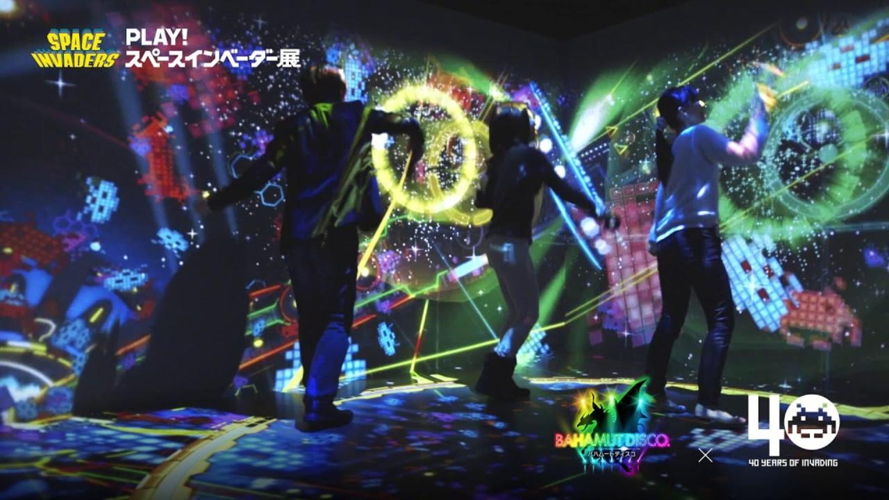 Bahamut Disco is a musical interactive installation full of lights and color. The titular dragon Bahamut will at times make an appearance. The experience often crosses over with the sprites from Space Invaders. It is installed within the Huis Ten Bosch theme park in Nagasaki, Japan.