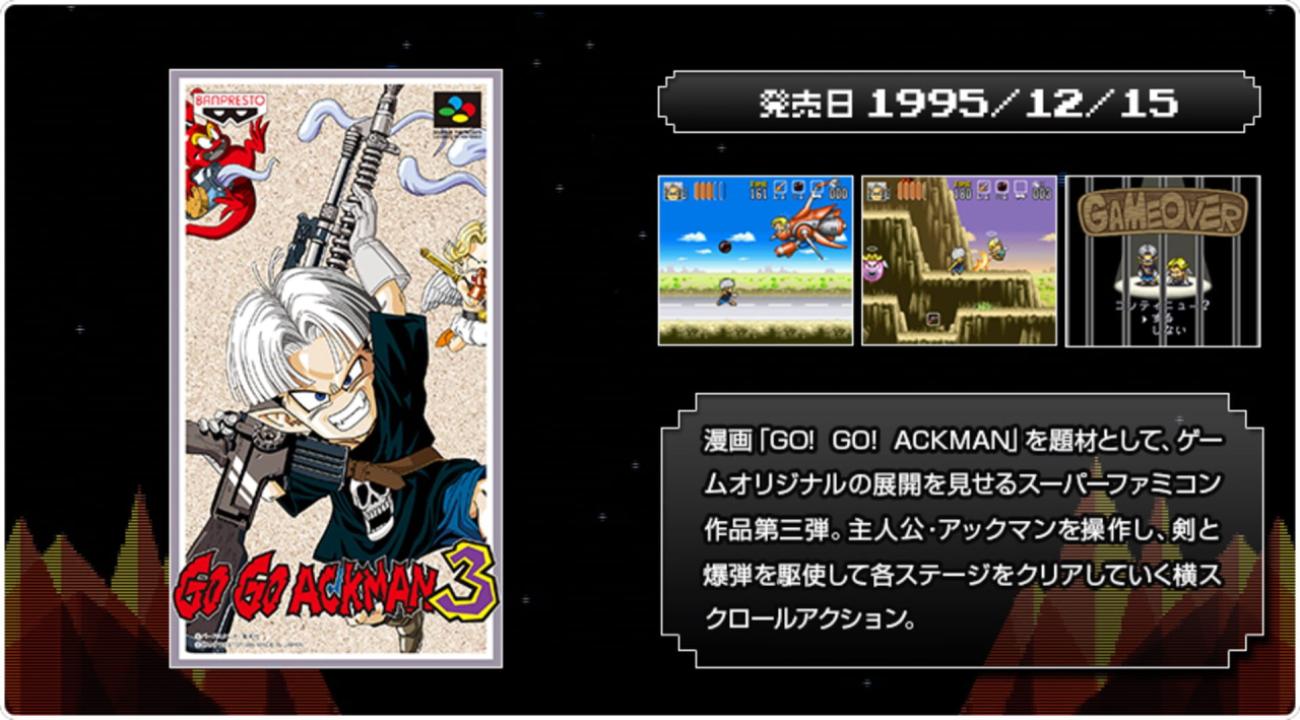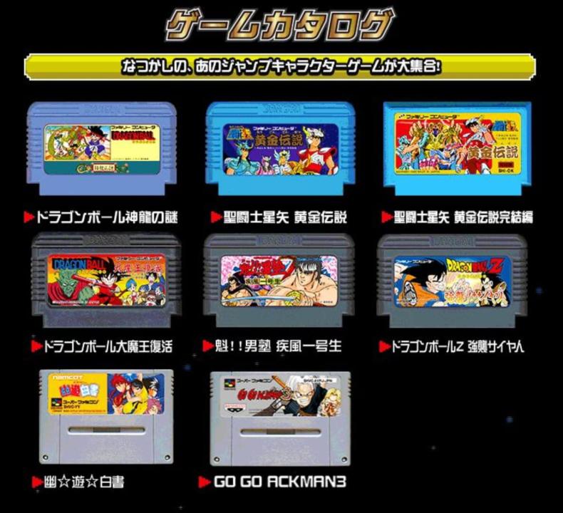 J Legend Retsuden is a compilation of Famicom/Super Famicom games based on Shonen Jump-licensed properties. Included games: Dragon Ball: Shenron no Nazo Saint Seiya: Gold Legend Saint Seiya: Gold Legend Finale Dragon Ball: Daimaou Fukkatsu Sakigake!! Otokojuku Dragon Ball Z: Kyoushuu! Saiyan YuYu Hakusho Go Go Ackman 3 Dragon Ball Z: Super Butouden 2 Dragon Ball Z II: Gekishin Freeza