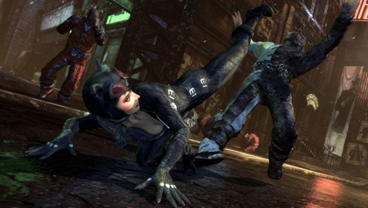Shortly before Bruce Wayne is arrested and thrown into Arkham City, Catwoman breaks into a house guarded by Two-Face's thugs. After neutralizing the goons, Catwoman opens a safe and retrieves a computer chip. Proud of her achievement, she is caught off guard when Two-Face holds a gun to her head.