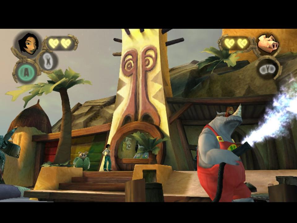 Beyond Good & Evil is an action-adventure game with elements of puzzle-solving and stealth-based games. The player controls the protagonist, Jade, from a third-person perspective. Jade can run, move stealthily, jump over obstacles and pits, climb ladders, push or bash doors and objects, and flatten herself against walls. As Jade, the player investigates a number of installations in search of the truth about a war with an alien threat.