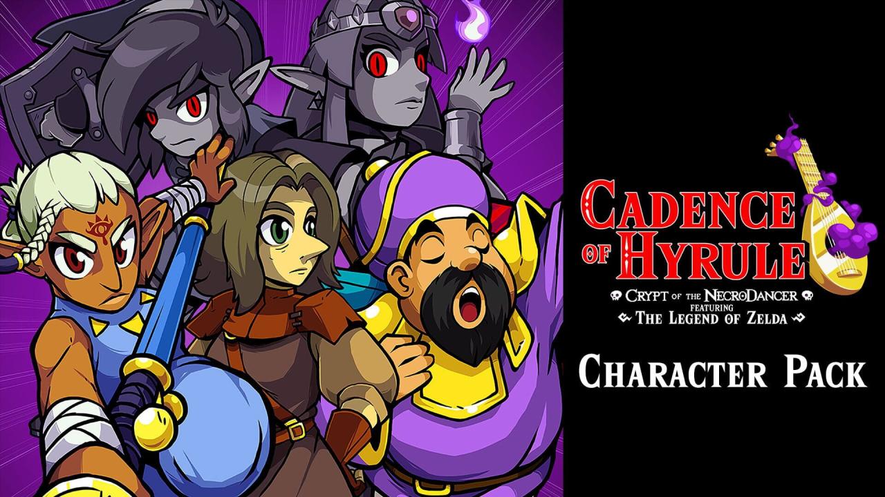 You'll be able to play as five additional characters in this DLC for Cadence of Hyrule: Crypt of the NecroDancer Featuring The Legend of Zelda. Play as Impa, Shadow Link, or Shadow Zelda from the Legend of Zelda series in addition to Frederick (the shopkeeper) and Aria (Cadence's grandmother) from Crypt of the NecroDancer. Each character has their own set of abilities - Impa can teleport behind enemies and Frederick comes back to life as a ghost! Take on All Character Mode's 21-floor dungeon and defeat Ganon with each character. Or, challenge yourself in Mystery Mode where all items and enemies are displayed as question marks!