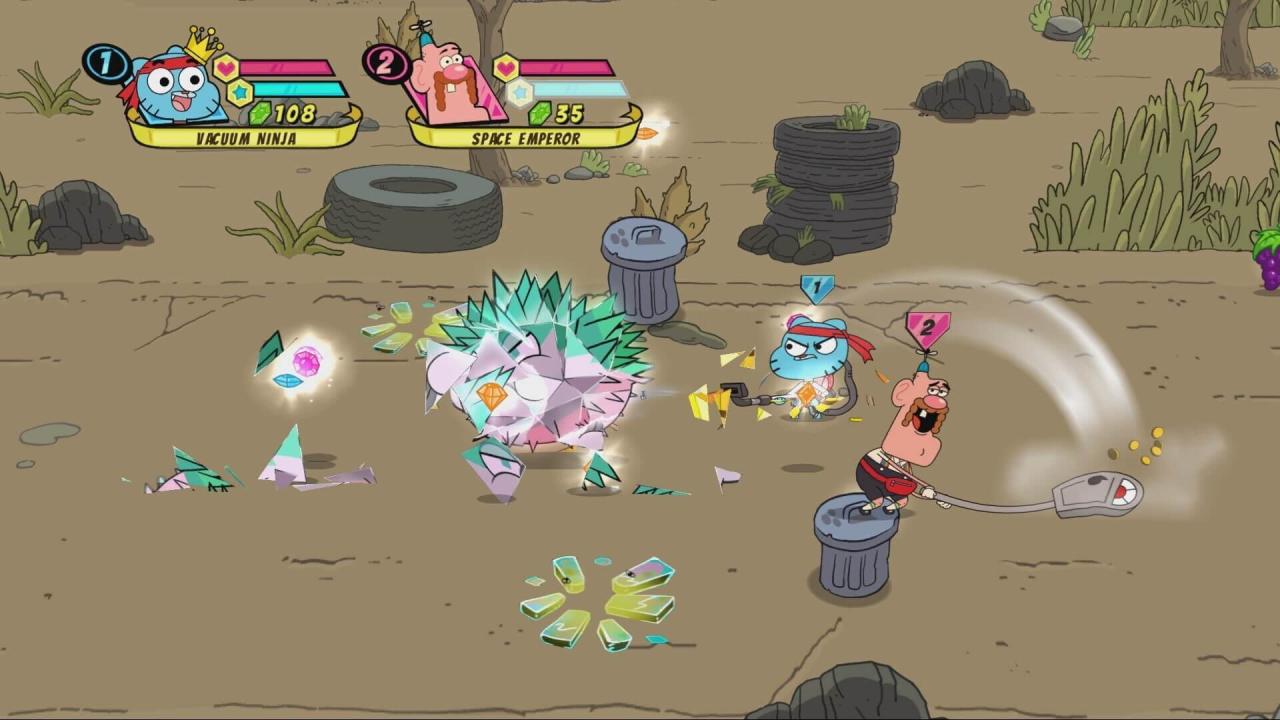 "When Uncle Grandpa accidentally drives the UG-RV through multiple dimensions, he picks up some surprise passengers in the form of Gumball, Steven Universe, Finn, Mordecai and Clarence! Now they'll have to band together to defeat the evil shard creatures and set things right. Use each character's unique attacks and special moves to conquer the elements, fight your way through all the levels and beat some brutal boss battles. Replay maps with special modifiers to switch up the fun, and unlock bonus rooms along the way. Take on the single-player challenge in this crazy interdimensional adventure." (3DS Version does not have multiplayer)