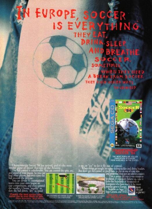 Championship Soccer '94 is based on the computer game Sensible Soccer: European Champions. The gameplay is identical: a fast-paced, top-down soccer game with emphasis on fast passes and simple control system. Players can choose between 40 national, 64 club or 64 custom (fantasy) teams and can assemble their own tournaments (cup or league) with them. The number of participating teams and some of the rules can be customized. The main difference to the original is the reduced number of pre-set tournaments: for national teams World cup qualifiers and the new Maastricht Cup (a knockout tournament) and for club teams the European Superleague and EUFA Cup. Custom teams only have the Booby League and Turkey Tournament available anymore. Another important difference is that the athletes and tournaments no longer use original names, e.g. EUFA instead of UEFA. The SEGA CD version uses its increased storage capacity for additional sound and some rendered movies, e.g. a flight over a stadium before starting a match. Like the computer version, the only major change compared to the predecessor are the additional eleven national teams and updated team rosters. It also features the World Cup 1994 as pre-set tournament (with the original groups) instead of World Cup qualifiers. Otherwise it keeps the same pre-set tournament options and the option to create own tournaments (cup or league) with the 51 national, 64 club and 64 custom (fantasy) teams. The Genesis version features original names which are slightly changed in the European SNES version (e.g. Klonsmann instead of Klinsmann). In the US version, the names have no resemblance to original athletes.