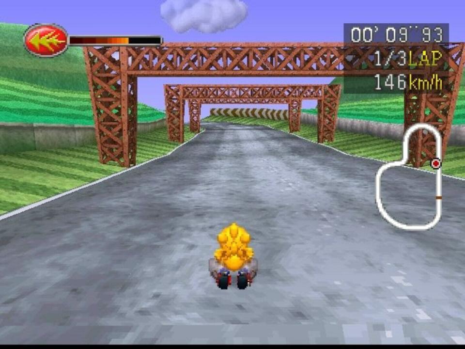 The Chocobo has appeared in every Final Fantasy game since Final Fantasy IV as a large yellow bird that you can ride to other destinations or use during fights. With Chocobo Racing, you can race a Chocobo along with a range of different characters both from the Final Fantasy world including Cloud and Cid from Final Fantasy VII and created just for the game through many different fantasy worlds at high speed, using a selection of weapons to aid you. The game supports 1 and 2 player racing