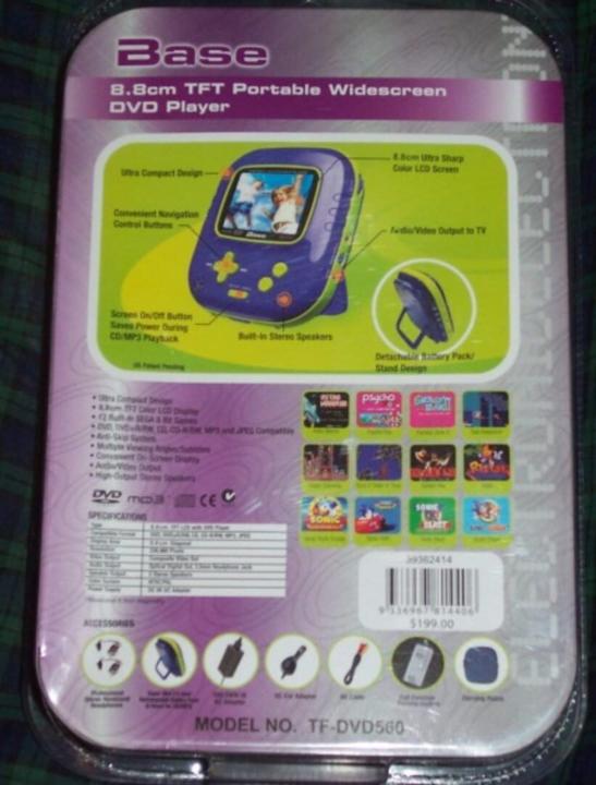 The TF-DVD560 is a portable DVD player released in 2006, manufactured by Coby with 12 built-in Sega Game Gear and Master System games. It has a 3.5 inch TFT screen and runs off an AC adapter, car adapter or lithium ion battery. The games are emulated using console-on-a-chip hardware licensed from AtGames.