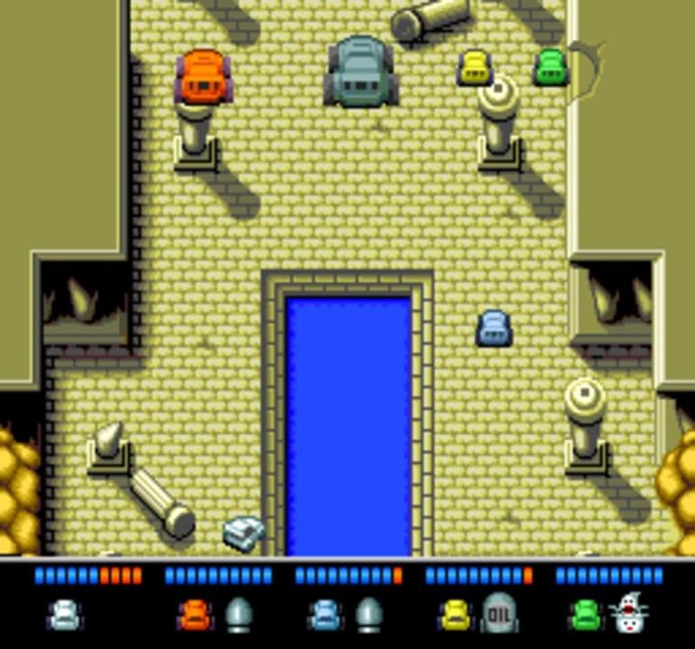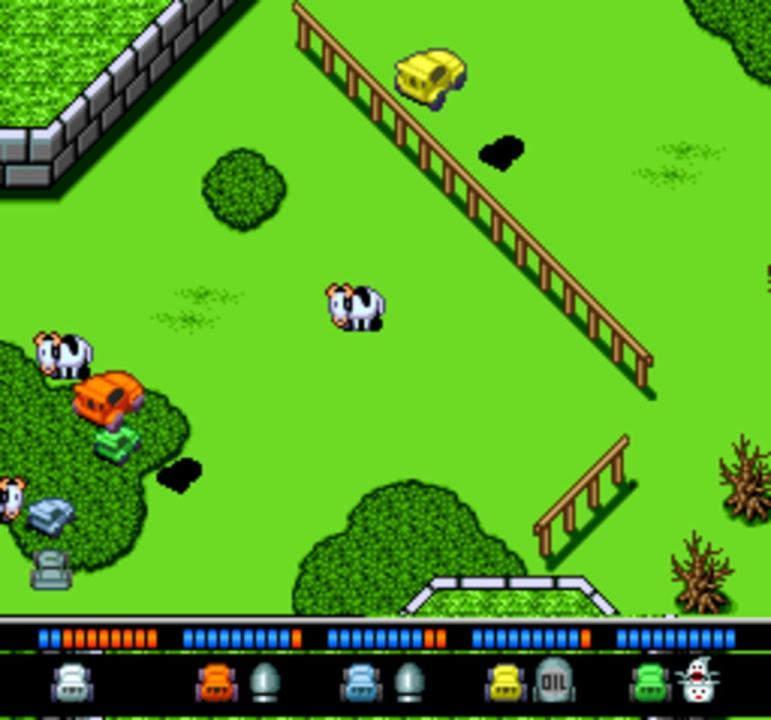Dekoboko Densetsu is a humorous game that combines elements of arcade action and racing. Up to five players can compete in the races. All the stages are vertically-scrolling (top-down), with the cars represented as small sprites of different colors. The player's goal is not only to beat the other cars, but also reach the finish line safely: each car has limited hit points, and continuously receives damage during the race.