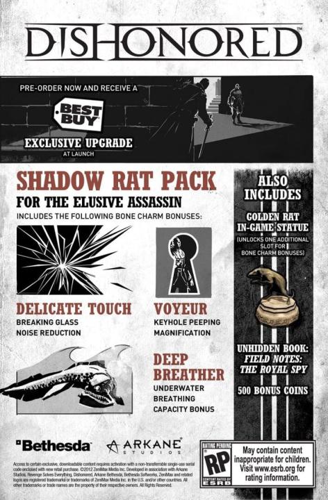 The gifts of the Outsider are bestowed unto those who walk the Void. With the Void Walker’s Arsenal add-on pack, gain immediate access to four content bundles previously available only through pre-ordering Dishonored. The Acrobatic Killer Pack, Arcane Assassin Pack, Backstreet Butcher Pack and Shadow Rat Pack offer unique character bonuses, additional bone charm slots, unhidden books and bonus coins that will aid you in your pursuit of revenge. Found in the Hound Pits Pub, use these items to enhance your playthrough of Corvo’s main campaign in the original game.