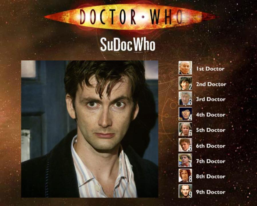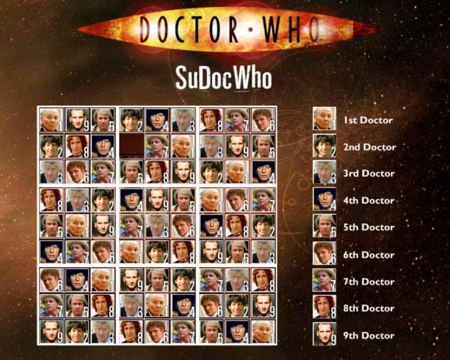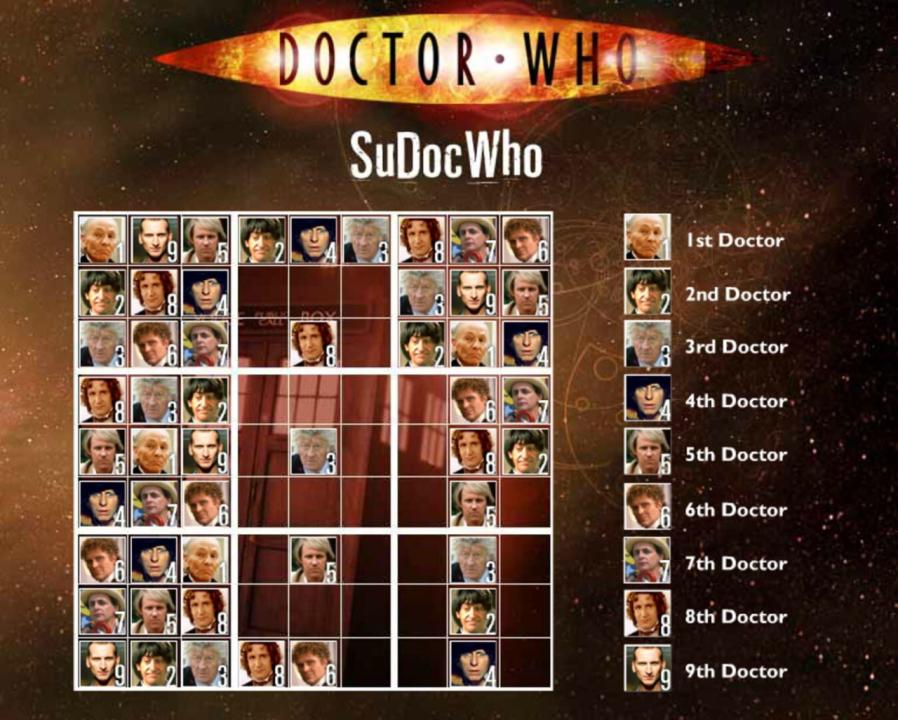 Each Doctor can only appear one time in each row, column and 3x3 square. The Doctor Who SuDocWho game is a Sudoku game with nine Doctors. The same rules apply as in a normal Sudoku game. Instead of nine numbers nine Doctors can be added. Completing the puzzle reveals the next doctor.