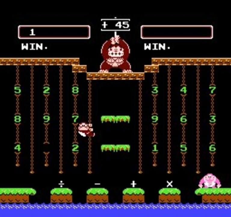 The game features one and two player modes, both of which are single screen. In the first mode, the objective is to enter math answers in order to receive points. These questions include addition, subtraction, multiplication, and division. In the two player mode, two players control two characters as they race to create a math formula to reach the number shown by Donkey Kong, incorporating platform gameplay. The mechanics are similar to Donkey Kong Junior; players climb vines to reach higher areas in order to collect numbers scattered around the area. In order to complete mathematics problems, players must collect at least three things: the first number, the symbol necessary to reach the number shown by Donkey Kong, and the second number. When the game features a high number, such as 66, players must collect multiple numbers and mathematics symbols in order to reach this. For example, players could choose a nine, a multiplication symbol, and a seven, followed by an addition symbol and a three to reach the number 66. The two player game have two different levels, Calculate A and Calculate B. Calculate B is more challanging, not only the goal is a negative number, but giving players the set number.