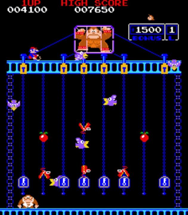Donkey Kong Junior is the direct sequel to Donkey Kong. In this game, Mario plays the antagonist, finally having captured Donkey Kong, and has put the ape in a locked cage. As Donkey Kong Jr., players will have to make their way through four different levels (Vines, Springboard, Chains and Mario's Hideout) in an attempt to find keys to free the little monkey's father.