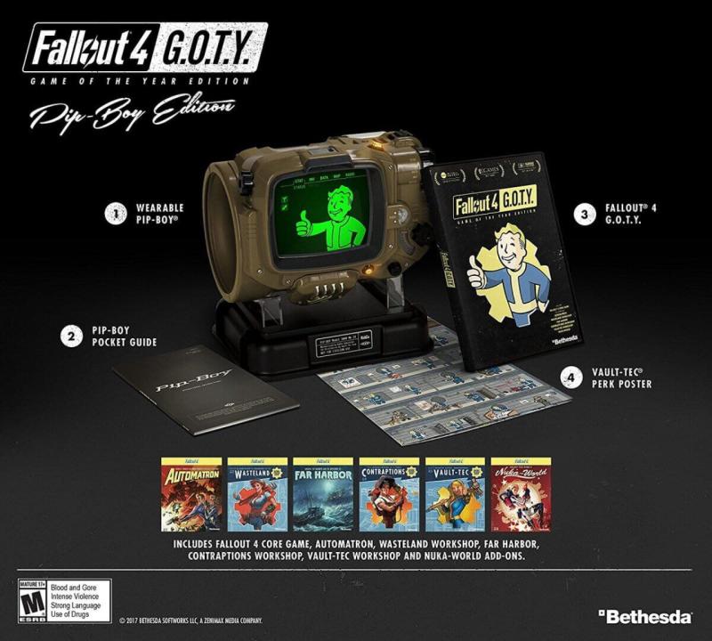 In addition to including the award-winning original game and official add-ons, Fallout 4 G.O.T.Y. Pip-Boy Edition includes: Pip-Boy Replica and Stand. This wearable device faithfully replicates the in-game model and comes complete with RobCo Industries stand, adjustable foam cuff, rotating knobs and lights. Designed to accommodate a variety of smartphone devices with customizable foam inserts, the Pip-Boy is the ultimate accessory for the official Pip-Boy companion mobile app that allows players to manage their in-game inventory, perks, holotapes, and more.