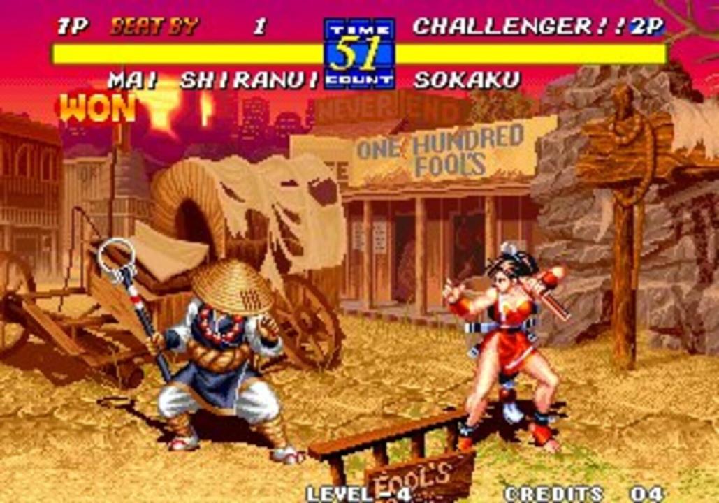 An adaptation of the Neo-Geo fighting game. 2-D scrolling one-on-one fighter with pseudo-3D aspects (that allows for players to "escape" holds, throws, and other attacks). Part of the incestuously-popular SNK fighting game pantheon...