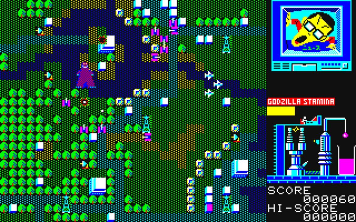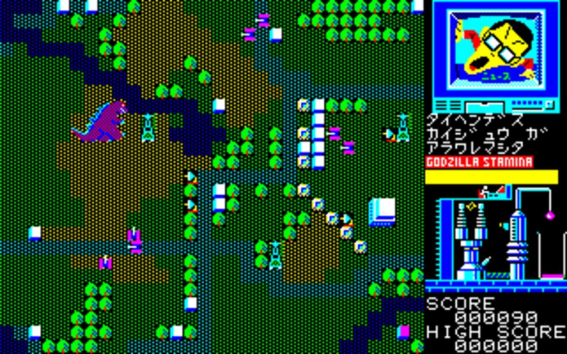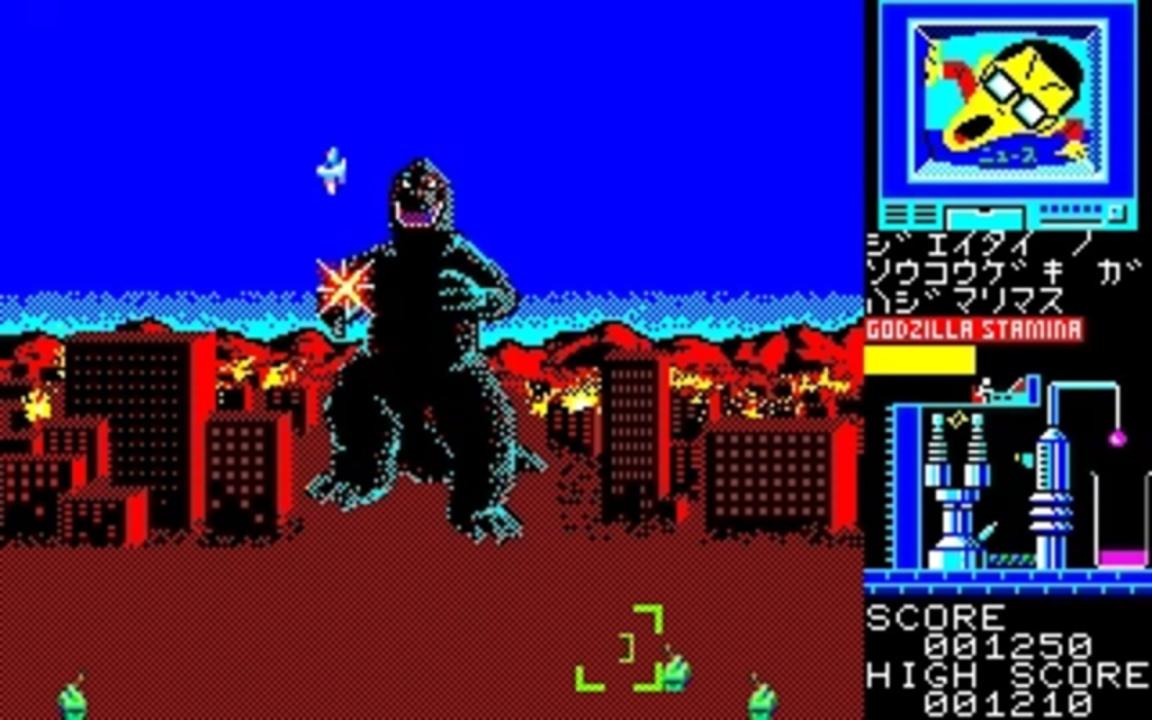 The player takes control of Godzilla in this game. Godzilla goes through towns and forests. Godzilla can step on tanks and fire his atomic breath at soldiers which gives him points. There is a yellow bar that indicates Godzilla's stamina. Above it, there's a container that fills up with purple liquid as the game progresses. A newscaster appears in the top-right corner of the screen, delivering news as the action unfolds.
