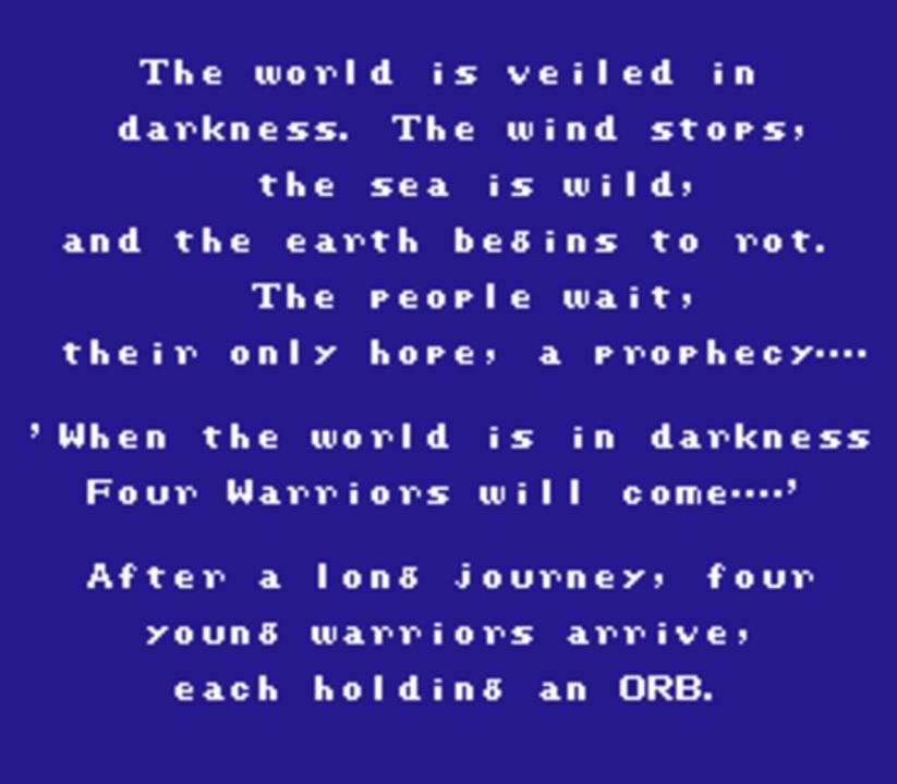 Final Fantasy, also known as FFI in re-releases, is the first role-playing game title in Square's flagship Final Fantasy series. The game puts players in control of four characters known as the Warriors of Light, and begins by asking the player to select the classes and names of each. The Warriors of Light can traverse the maps of dungeons and towns, which are connected by a world map, and will run into random encounters with enemies or fight bosses.