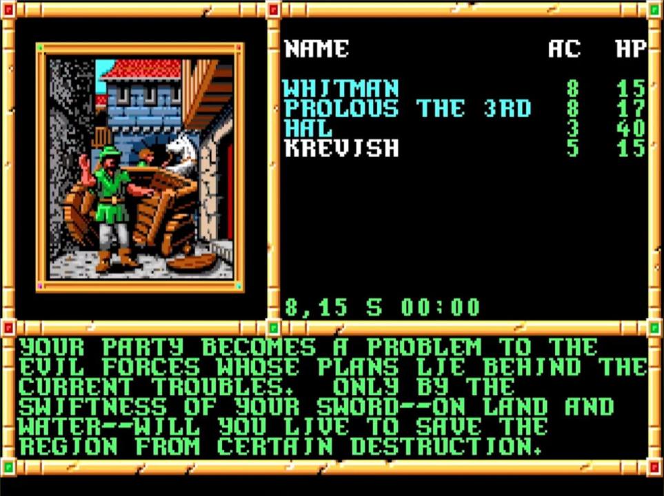 The game revolves around a standard (for Gold Box adventures) party of six adventurers who inadvertently get caught up in a plot by the Zhentarim to conquer the entire Frontier area. The storyline, in rough terms, follows: The party starts off in Yartar, having just escorted a caravan from the dwarven stronghold Citadel Adbar (ruled by the dwarf king Harbromm). At the tavern, while the party is enjoying the feast and spirits, something is slipped into their food that causes them to pass out, and they are robbed of all gold and gear, especially the magic longsword that one member used to slay a griffon at Longsaddle. Fortunately, each character keeps a purse of coins under their pillow so they can buy armour and weapons. Through rescuing the NPC Krevish, the party being hired by the Kraken in Yartar to assassinate a cleric of Bane at Nesme, only to discover that this evil priest was the only individual standing in the way of the conquest. Rescuing the magic user Amelior Amanitas from Everlund, an eccentric and somewhat absent-minded wizard who explains how to stop the Zhentarim. Returning to Yartar, the party is captured and imprisoned in a Kraken base below the city. There, the magic longsword stolen at the start is recovered but the party has to fight four giant squid in a huge tank before escaping. Finding four magical statues scattered across the frontier before the Zhentarim, led by a General Vaalgamon, gets to them. Traveling to the dead city of Ascore to end the Zhentarim plot. Basically, Zhentil Keep plans to use these magical statues to open a way through an otherwise-unpassable desert for their armies. If successful, the party is hailed as the "Heroes of Ascore," which is carried over into the sequel.