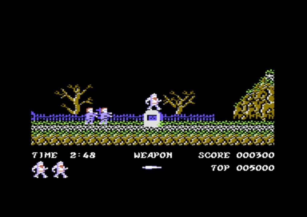Ghosts 'n Goblins is a platform game where the player controls a knight, named Sir Arthur, who must defeat zombies, ogres, demons, cyclops, dragons and other monsters in order to rescue Princess Prin Prin, who has been kidnapped by Satan, king of Demon World. Along the way the player can pick up new weapons, bonuses and extra suits of armor that can help in this task. The game is often considered very difficult by arcade standards and is commonly regarded as one of the most difficult games ever released. The game is considered by Gametrailers.com to be the world's second most difficult game ever made. The player can only be hit twice before losing a life (the first hit takes away Arthur's armor, and the player must continue on in his underwear until completing the level, or finding replacement armor). If the player loses a life, he is returned to the start of the level, or the halfway point if he has managed to get that far. Furthermore, each life can only last a certain length of time (generally around three minutes), the clock being reset at the start of a level. If the clock does run out, the player instantly loses that life. After defeating the final boss, but only with the cross weapon (if the player does not have the cross weapon, they will be prompted that it is needed to defeat the boss and restart at the beginning of level 5 and must repeat round 5 and 6 again regardless if the weapon is obtained immediately or not) for the first time the player is informed that the battle was "a trap devised by Satan". The player must then replay the entire game on a higher difficulty level to reach the genuine final battle.