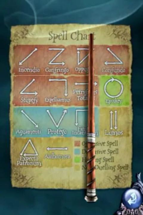 In Harry Potter: Spells, the player is invited to Hogwarts School of Witchcraft and Wizardry. The player will get a wand and will be Sorted in one of the four Hogwarts Houses by the Sorting Hat. There are twenty-three spells to learn in three different difficulty levels. If the player is able to do this right, he or she earns House points. If the player learns enough spells, he or she can do an online Wizard Duel.