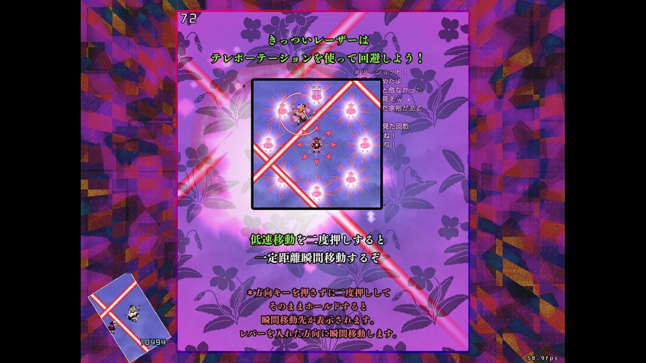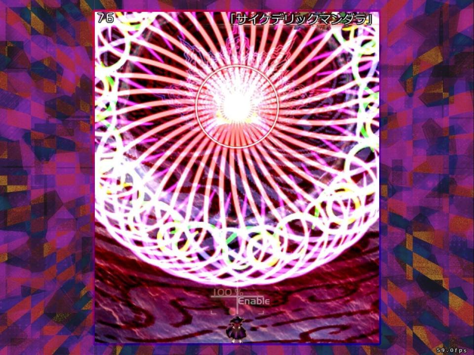Violet Detector, like its predecessors Shoot the Bullet, Double Spoiler and Impossible Spell Card, is a collection of many individual danmaku patterns that the player can choose from at their leisure. In addition to the usual mechanic of taking photographs that clear enemy bullets, Sumireko has several psychic superpowers at her disposal, such as teleportation. The game features all of the characters who debuted in Legacy of Lunatic Kingdom and Hidden Star in Four Seasons, plus Reimu, Marisa, and most of the final and EX bosses from previous games.