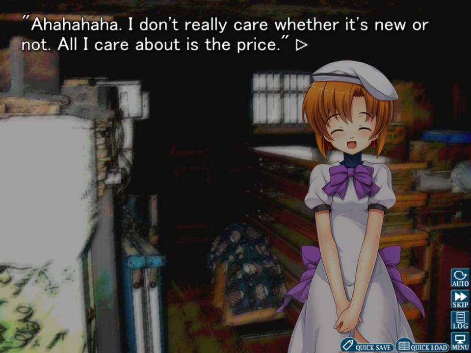 Higurashi When They Cry is a sound novel. The music, backgrounds and characters work together to create a world that is the stage of a novel for the user to read. They laugh and cry and get angry. The user takes the point of view of the protagonist to experience the story.