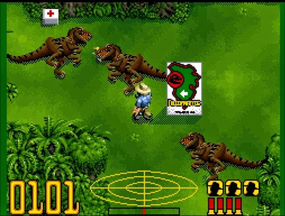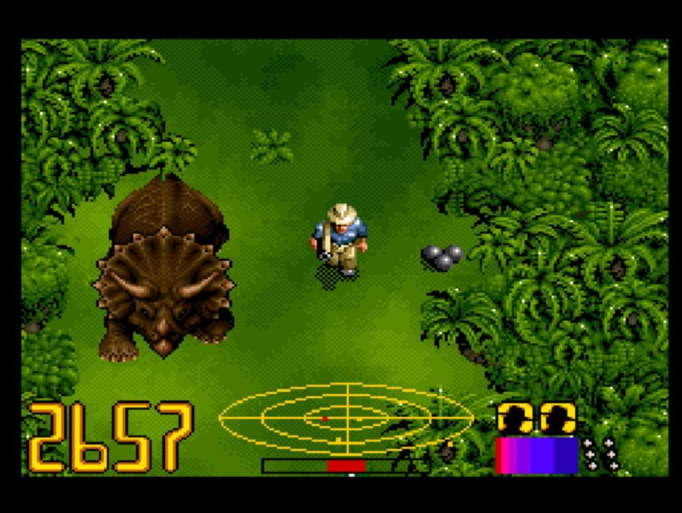 Jurassic Park is an action-adventure video game for the Super NES based on the movie adaptation of the book by Michael Crichton. It was developed by Ocean Software and released in 1993 in North America and PAL regions, and published and released by Jaleco in 1994 for Japan. Most of the game is viewed from a top-down view. When the player enters a building, the gameplay perspective shifts to a first-person view. The game is significant for combining two different perspectives and for being an early game mastered in surround sound (Dolby Pro Logic).