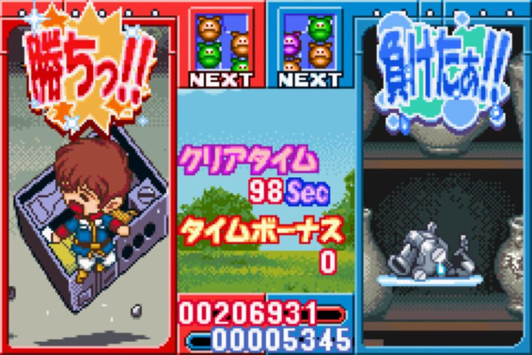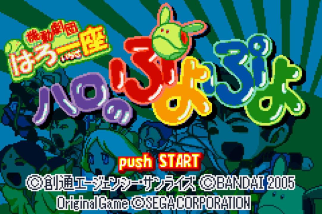 Gundam-flavored Puyo Puyo. Kidou Gekidan Haro Ichiza: Haro no Puyo Puyo is a Puyo Puyo game based on the Mobile Suit Gundam franchise, the original TV series in particular. Puyos are replaced by Haros, and several Gundam characters are playable. The game features a story mode, a verses mode, and a survival mode where random characters throw garbage Haros into the player's field. Whenever a chain is completed, the chosen character will shout a famous phrase from the anime series; the game provides a large number of phrases that can be assigned to each character by the player.