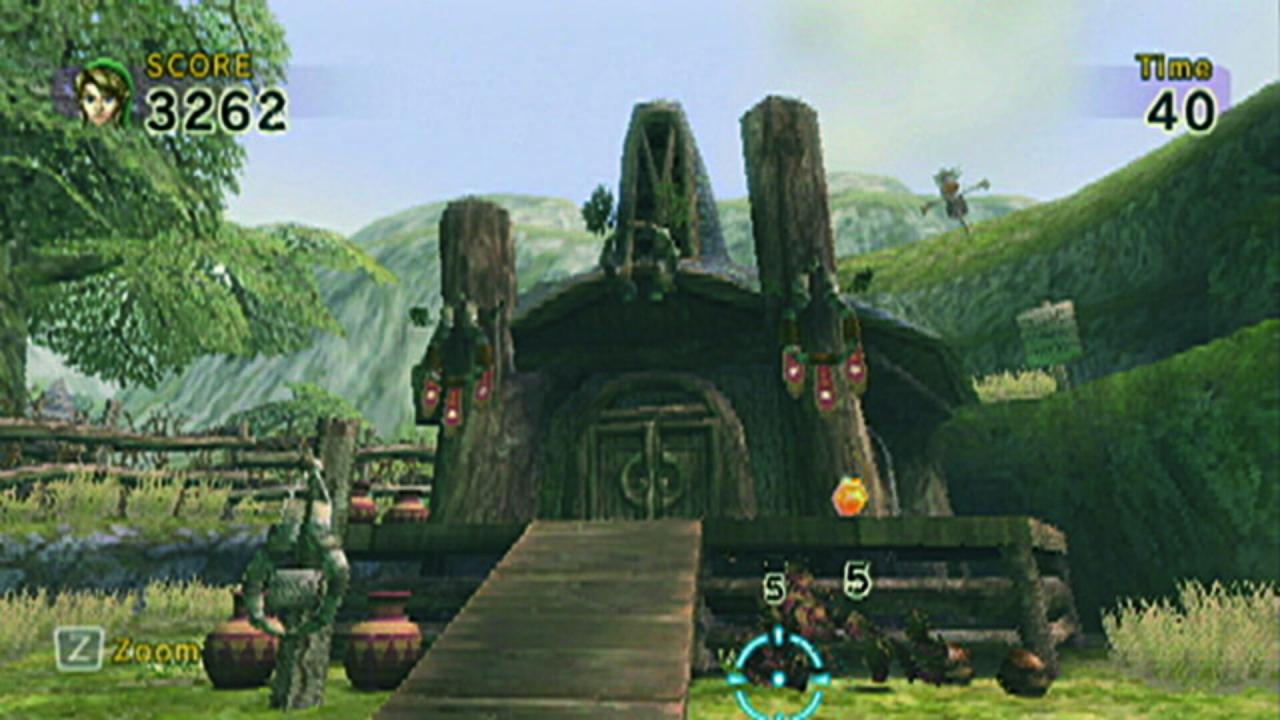 Link returns from The Legend of Zelda: Twilight Princess to pick up the Wii Zapper and take aim at a host of targets in this shooting-gallery-style game. Anyone can pick up the Wii Zapper and become a master marksman in the quick-play shooting galleries of Link's Crossbow Training. Dozens of fast-paced stages offer a wide variety of game play, from shooting stationary targets to defending a supply wagon from onrushing hordes of enemies. Multiplayer modes let players and their friends share a Wii Zapper to shoot for the high score. Link's Crossbow Training comes bundled with the Wii Zapper. After a few rounds of Link's Crossbow Training, players will be more than ready to pick up any of the future Wii Zapper titles, like Medal of Honor Heroes 2, Ghost Squad and Resident Evil: The Umbrella Chronicles. Link's Crossbow Training contains three basic game styles: target shooting, defender and ranger. There are 27 stages in total, and these categories represent only generally how each individual stage operates. Each stage's goal is to earn the highest score possible within the time limit. All rounds can be played with multiple players: Players pass the Wii Zapper around and then play one at a time and compete for the high score. Target Shooting: In target-shooting rounds, players shoot bull's-eyes as they pop up on the screen. In early stages, targets are stationary. As the game difficulty increases in later levels, the targets move. Hitting the center of the bull's-eye nets more points, and hitting targets in succession without missing earns combo multipliers. Link can aim anywhere on the screen. Defender: In defender rounds, players remain stationary but can look and aim in all directions – sometimes even in a full 360 degrees – by aiming off screen. Hordes of enemies assault Link, and he must fight them off. These battles have a great deal of variety, from fighting off skeletons in a desert to defending a wagon from boar-riding Bokoblins. Ranger: In ranger rounds, players can move throughout the level using the control stick and aim anywhere they want by aiming the Wii Zapper wherever they want to look. In these missions, Link storms enemy encampments, fights his way through a forest and seeks out his foes while exploring the environments. The Wii Zapper requires the Wii Remote and Nunchuk, housing both in a comfortable and intuitive frame. The control stick on the Nunchuk controls player movement (on stages that allow player movement), while simply aiming the Wii Zapper moves the targeting reticule on the screen. Pulling the trigger fires Link's crossbow. By aiming off screen, players can turn Link to face in a new direction (again, on stages that allow this).