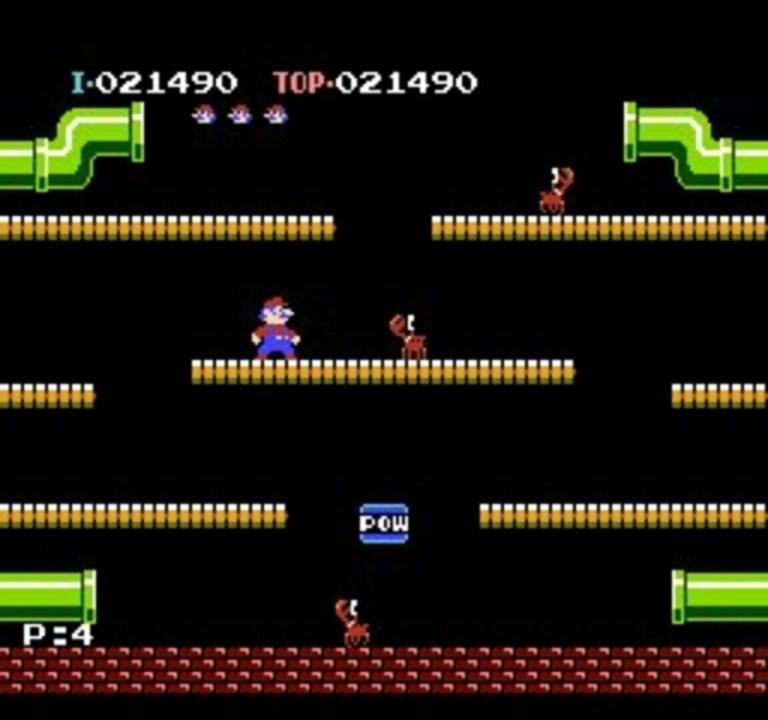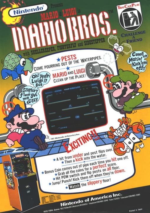 Mario Bros. is an arcade game published by Nintendo and developed by Shigeru Miyamoto. The platform puzzle which first introduced Luigi to the world has both single and multiplayer action with two differing game types, but with the same objective. Crabs, turtles and fighter flies must be cleared out by jumping underneath the platform they sit on, then kicking them away. Each level is cleared when a set number of coins is collected. For the two player mode, the first to collect the set amount of coins wins.