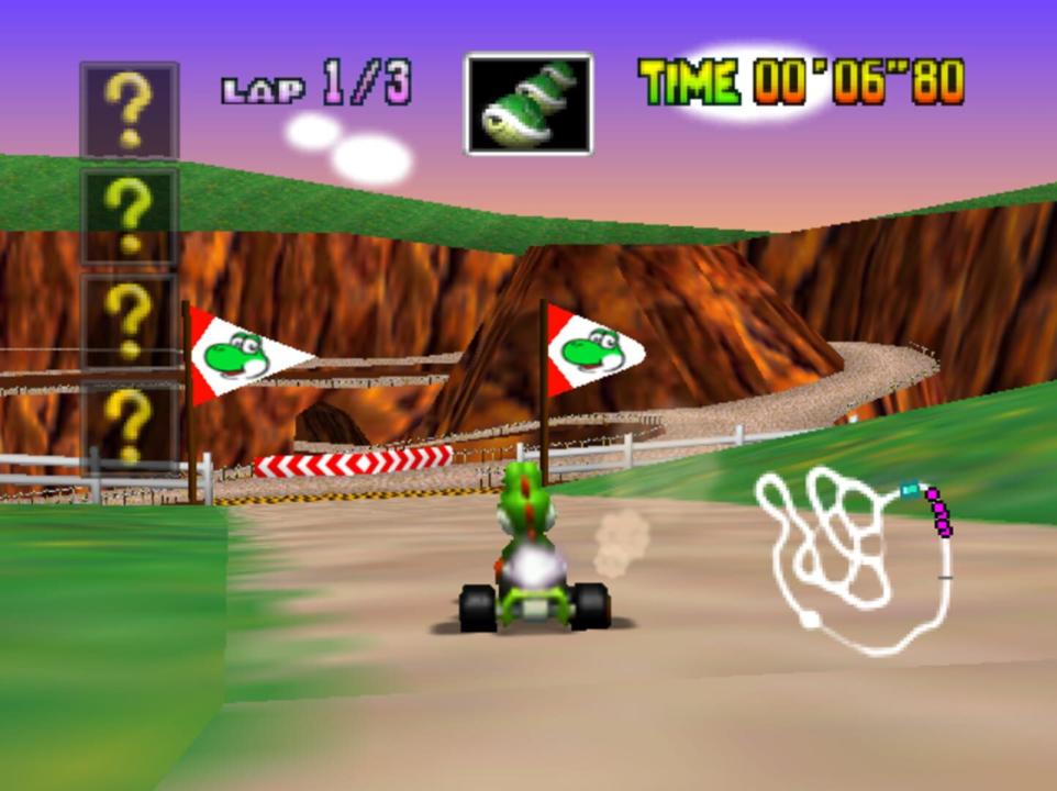 Mario Kart 64 is the second main installment of the Mario Kart series. It is the first game in the series to use three-dimensional graphics, however, the characters and items in this game are still two-dimensional, pre-rendered sprites. The game offers two camera angles and three engine sizes: 50cc, 100cc and 150cc. Each kart has distinctive handling, acceleration and top speed capabilities. Shells that you fire at rival racers, Bananas that make them skid out and Lightning Bolts that make them small and very slow are just a few of the game's unique power-ups.