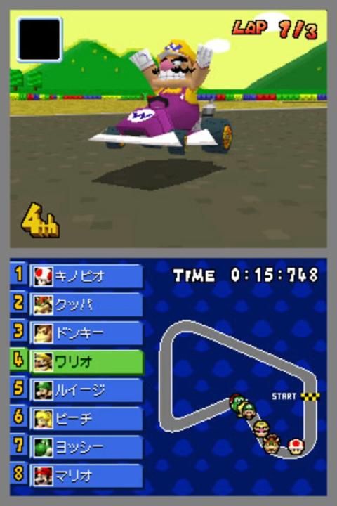 Mario Kart DS is the continuation of the long running racing game series that began on the Super Nintendo. It features 16 new tracks as well as 16 tracks from the previous 4 games, with each set split up into the Nitro and Retro Grand Prix respectively. Eight racers are initially available, each with two go-karts to choose from. A number of characters and additional karts are also available to unlock. New items have been added to the arsenal, including a Blooper squid that squirts ink onto the screens of other players and a Bullet Bill power up that transforms the player into a giant, fast-travelling bullet on autopilot.