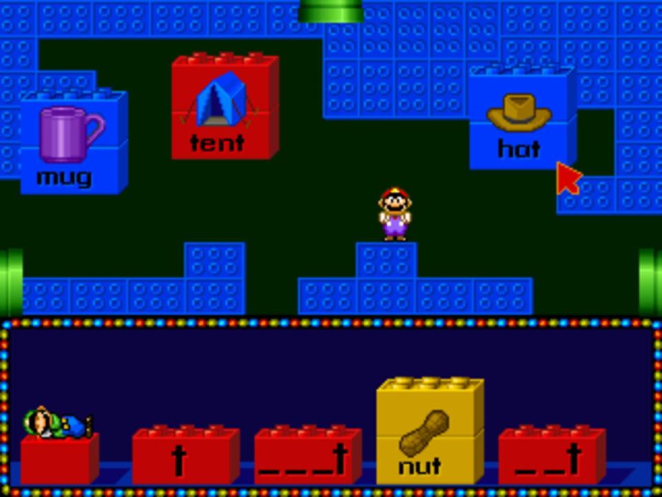 Mario's Early Years: Fun With Letters is a collection of letter-related activities for kids ages 3 to 6. Playing with either Mario or Princess Toadstool, you select from 10 different activity worlds each filled with different activities that range from letter recognition to sentence fill-in, letter-sound recognition, vowel recognition, etc. Each activity can be played in either Discovery mode, where you are free to do what you wish, or in Learning mode, where Luigi guides you through the activities.