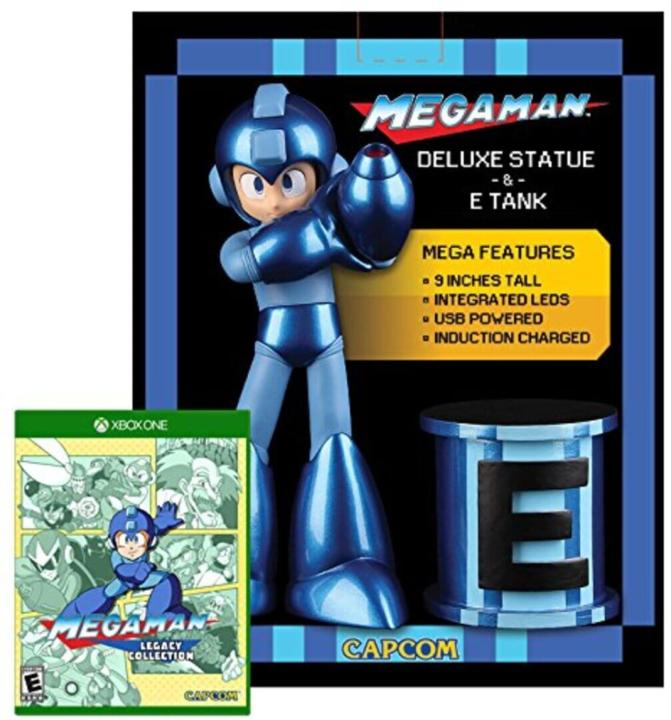 An Amazon exclusive limited Edition for PS4 and Xbox One that includes a 9" Mega Man Statue and a 4" E-Tank, powered by a USB cord and AC adapter, illuminating Mega Man's helmet and Buster weapon when powered-up.