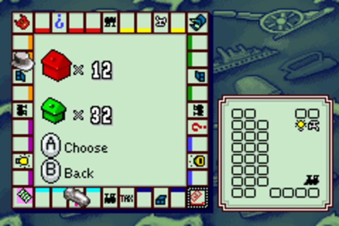 Monopoly is a GBA conversion of the classic board game of the same name. The game can be played with a computer player or another player. The game has 4 different modes to choose from including timed mode, custom mode, timed limit mode (playing the game with a time limit), and standard mode.