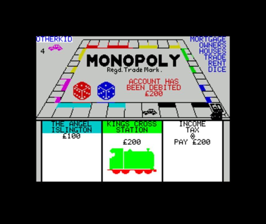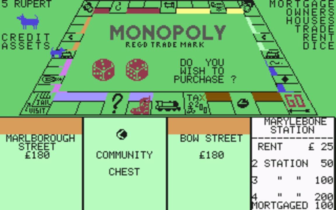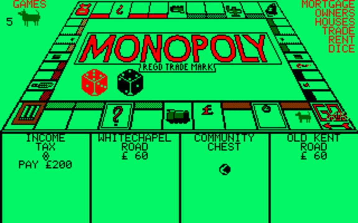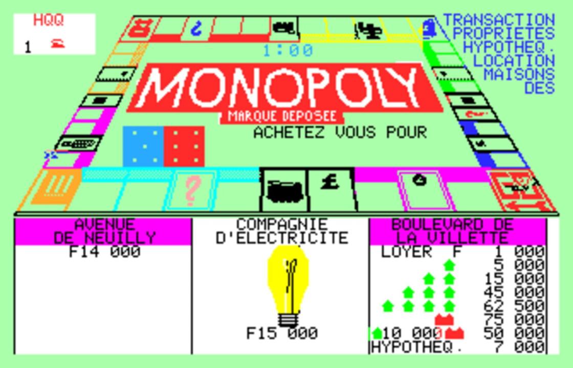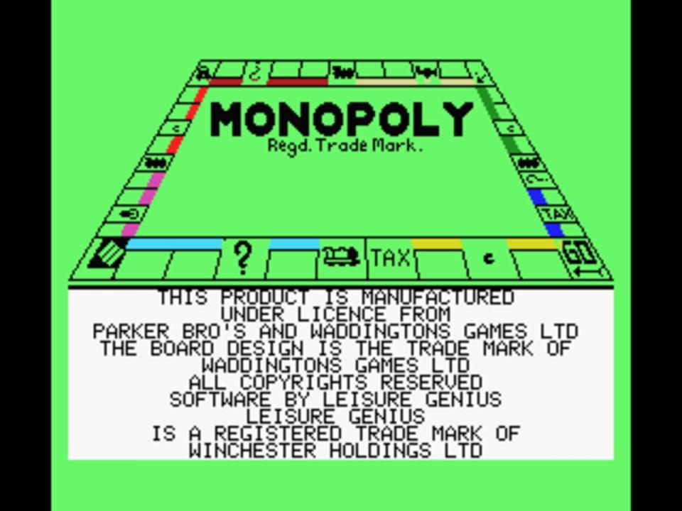 This version of the classic board game supports several graphic formats and offers some different options. From 2 to 8 players can play the game, and they can all be computer players if you wish. This allows you to just sit back and watch as the computer takes over. You can choose to play a short game with a specified time limit, or a standard game, and there is a save game feature. All actions are handled entirely by keyboard. Questions appear in the center area of the board (for buying property, for instance). Pressing the first letter of a word from the top bar takes that action (Q for Quit as an example). Player stats can be viewed on the screen.