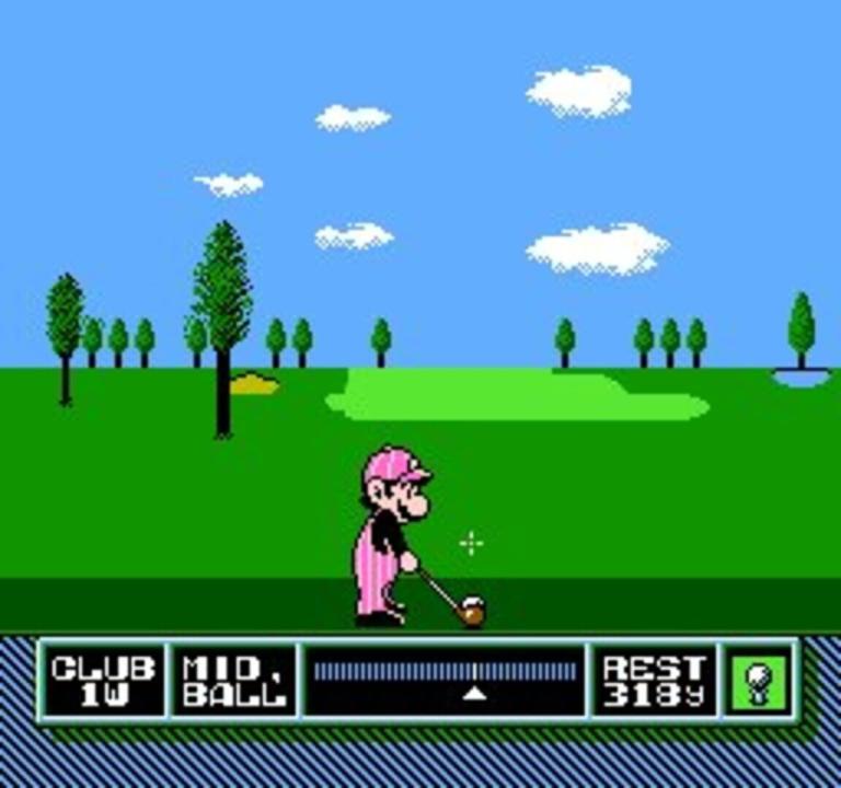 NES Open Tournament Golf is an NES game featuring Mario characters. As the name of the game implies, it is a golf game and was one of the first golfing games in the Mario series. You can play a round of golf on one of three different courses. One or two players can play in the U.S., Japan, or the U.K. and choose a stroke or match play game. Gameplay is from two point of views, starting with an overhead view allowing you to set up the shot and choose a club, then switching to a 3-D point of view. Hitting the ball uses the common power meter where tapping the button starts the meter, tap the button a second time to select the amount of power in the shot, then tap the button a third time to select the amount of slice or hook.