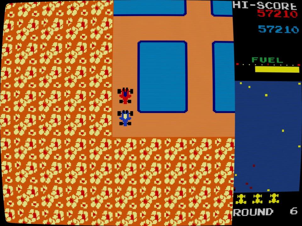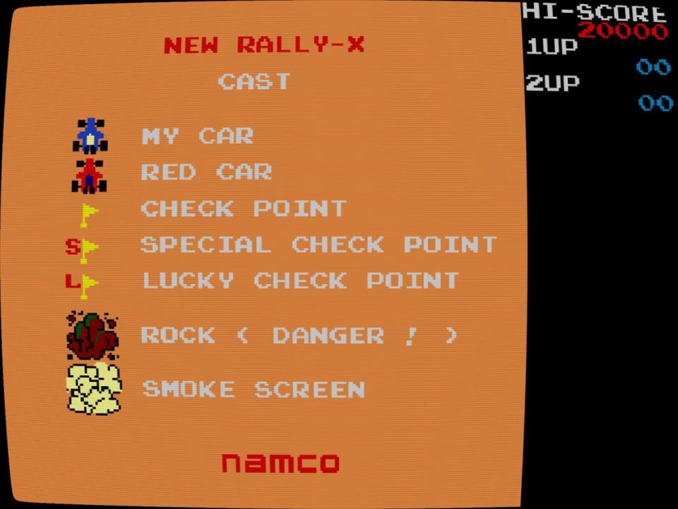 New Rally-X is a maze and driving arcade game that was released by Namco in 1981. It runs on similar hardware to that of its predecessor, and as its name suggests, it is a revised version of that title, which was released in the previous year. The only differences are that it has slightly enhanced graphics, easier gameplay, a new soundtrack, and a "Lucky Flag" (with the letter "L") that gives the player extra points for remaining fuel when collected, after which the round will continue if there are still flags remaining. The mazes are mostly identical, with some of the blocks from Rally-X changed into roads to reduce dead ends, and some different flag (and rock) locations. This title was manufactured in greater numbers and was much more popular in Japan than its predecessor.
