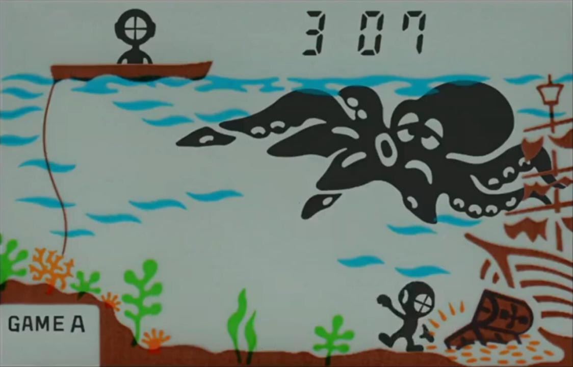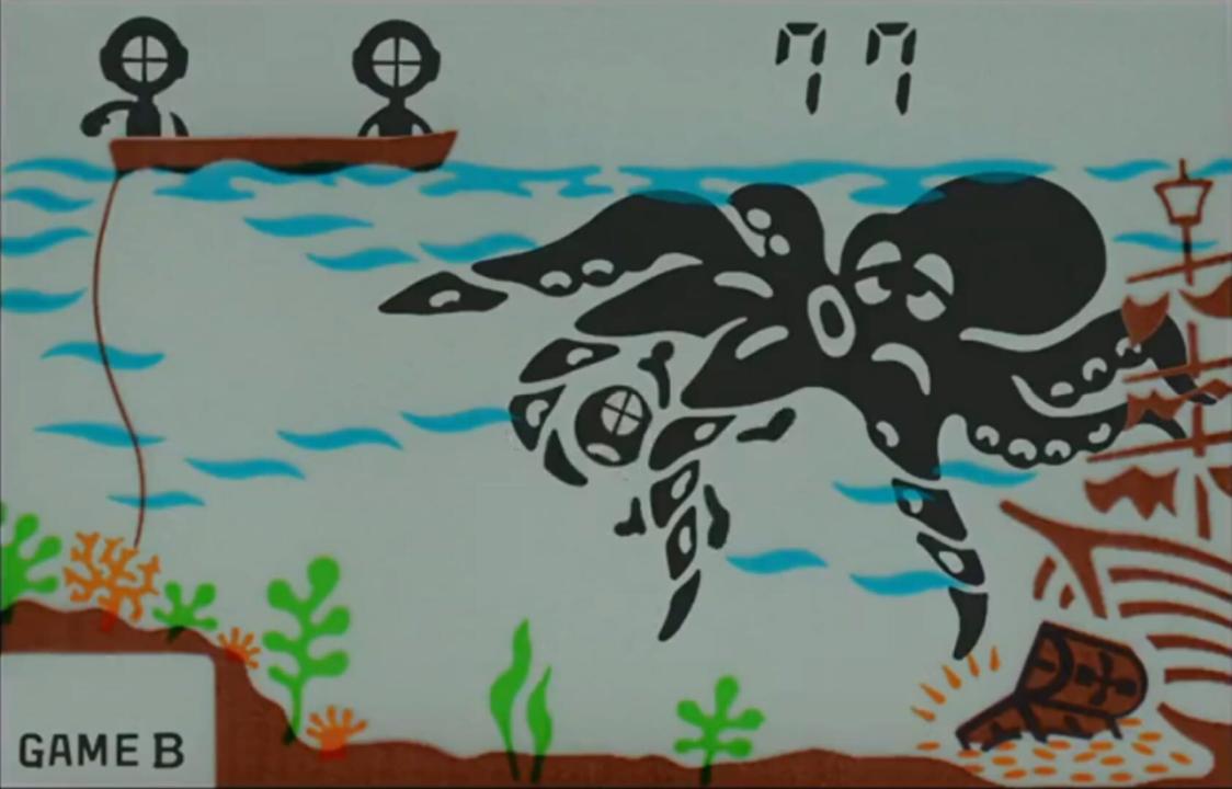 Octopus is a Game & Watch game that was released on the G&W widescreen series. In the game, you, the diver, must get around an octopus whom is trying to capture you and get to the treasure. When Mr. Game & Watch returns to the salvage ship, he gets three extra points. The player's three chances are measured by extra divers on the savage ship. When one is attacked by the Octopus' tentacles, another takes his place.