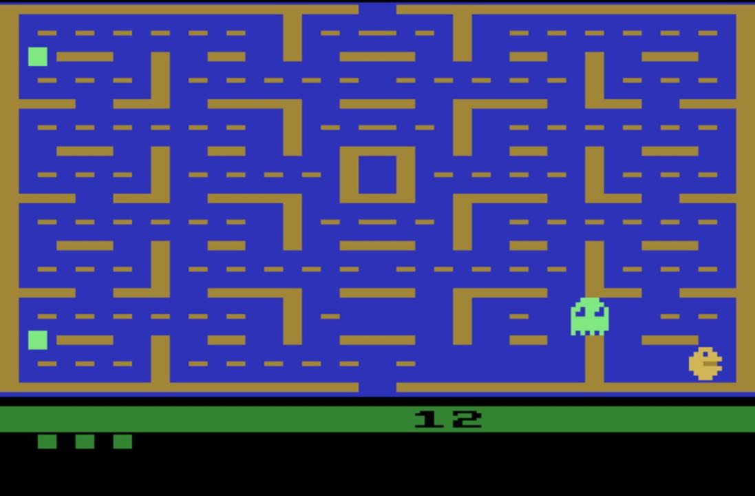 Atari 2600 Port of Pac-Man The player controls Pac-Man through a maze, eating pac-dots (also called pellets). When all pac-dots are eaten, Pac-Man is taken to the next stage. Between some stages one of three intermission animations plays. Four enemies (Blinky, Pinky, Inky and Clyde) roam the maze, trying to catch Pac-Man. If an enemy touches Pac-Man, a life is lost and the Pac-Man itself withers and dies. When all lives have been lost, the game ends. Pac-Man is awarded a single bonus life at 10,000 points by default. Near the corners of the maze are four larger, flashing dots known as power pellets that provide Pac-Man with the temporary ability to eat the enemies. The enemies turn deep blue, reverse direction and usually move more slowly. When an enemy is eaten, its eyes remain and return to the center box where it is regenerated in its normal color. Blue enemies flash white to signal that they are about to become dangerous again and the length of time for which the enemies remain vulnerable varies from one stage to the next, generally becoming shorter as the game progresses. In later stages, the enemies go straight to flashing, bypassing blue, which means that they can only be eaten for a short amount of time, although they still reverse direction when a power pellet is eaten; in even later stages, the ghosts do not become edible (i.e., they do not change color and still make Pacman lose a life on contact), but they still reverse direction.