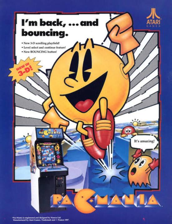 Pac-Mania is a variation on the game Pac-Man. You need to guide Pac-Man around a maze and eat all of the dots on the board in order to proceed on to the next round. Numerous, multi-colored ghosts also roam the maze trying to stop you. If you eat one of the power pellets in the maze, the ghosts will temporarily turn blue and run from you. Pac-man can earn bonus points by eating the ghosts when they are in this state. The maze is now in 3-D and is larger than screen which will scroll to follow the action. To help get out of tight spots, Pac-Man now has the ability to jump. But be careful, because some of the ghosts have learned this trick as well and you could end up in a mid air collision!