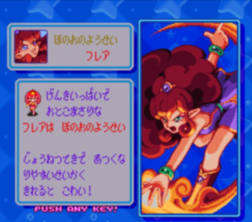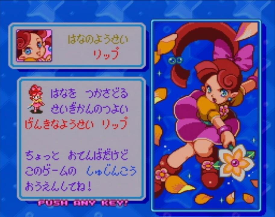 This is the world where the fairies live. Nature is rich, and all kinds of animals live peacefully together with the fairies. The fairies live with various things found in nature. Nothing in nature can survive without a fairy. [so basically, the fairy world is reliant on fairy magic to run properly.] They dwell together with all kinds of things, from water to the green of forests to fire to wind. Every fairy possesses magic as well. It's not intended to hurt anyone; instead, this magic is used to maintain the peace of the fairies' and animals' world. One of the fairies, the flower fairy Lip, is a cheerful and spirited young girl. Unfortunately, she isn't very good at using peacekeeping magic yet, so she has to use the help of her magic wand to cast spells. One day, out of nowhere, monsters appeared in this peaceful land and started wreaking havoc. They bullied the fairies, laid waste to the world, and did whatever they pleased! As if that weren't enough, they cast an evil spell on the fairies who were best friends with each other, causing them to fight with each other! "At this rate, those monsters will take over the entire fairy world!" One fairy alone--Lip, who managed to escape from the monsters' magic--went to rescue her fellow fairies.