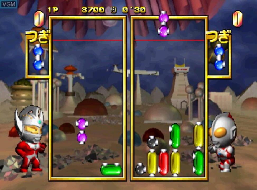 PD Ultraman Link is a falling-block puzzle game featuring the Japanese superhero Ultraman and many of his allies and foes. Blocks of various colors fall into the well in pairs; each block has two connections, and connecting three or more blocks together regardless of color will cause them to disappear. Any blocks above the ones removed will fall into the now-open space, potentially creating chain combos which will send garbage blocks that must be cleared twice to the opponent. Additionally, connecting four blocks of the same color will clear all blocks of that color from the board, while connecting four each of a different color together will clear all the garbage blocks on the screen by one stage. If the blocks stack past the line at the top of the well, that player loses the match. The game includes a single-player story mode, as well as a free battle mode against the computer or another player. There are 10 different characters to choose from: five Ultra Heroes and five aliens.