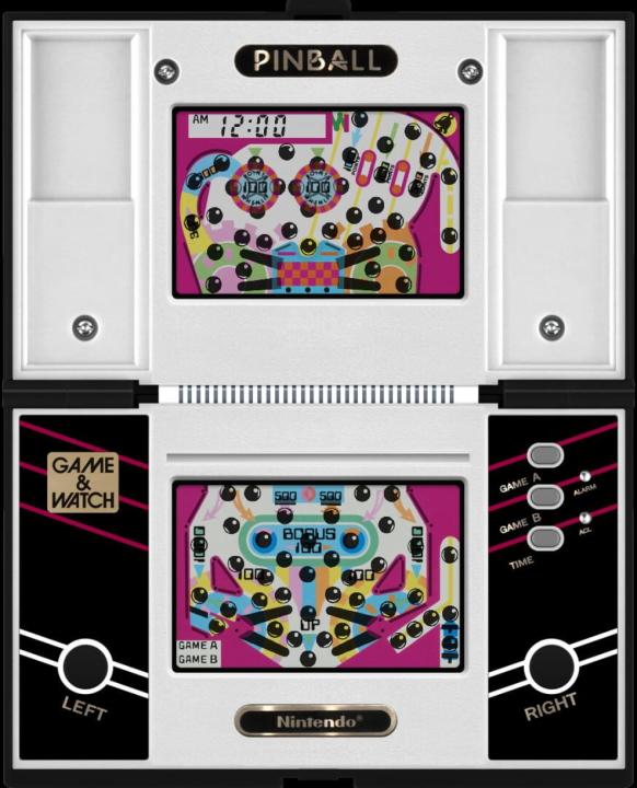 Pinball is a Multi Screen Game & Watch game released in December of 1983. Nintendo manufactured around 250,000 units of the game worldwide. It's basically just a portable pinball game where you control two flippers. The goal is to keep the ball above the flippers by hitting it. The ball will then go in a fairly random direction and hit the bumpers, thus giving the player points. The model number for the game was PB-59, with PB standing for Pinball.