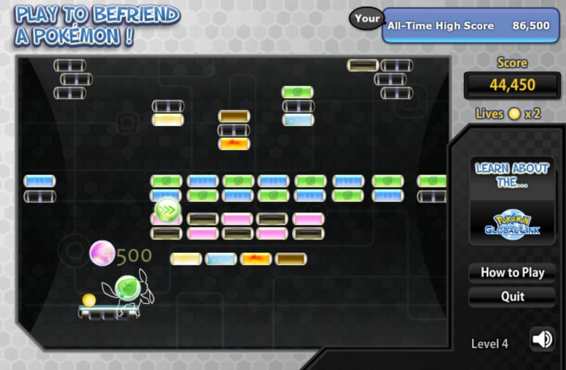 Play to Befriend a Pokémon! was a Flash game formerly available on Pokémon.com. It was a Pokémon Global Link promotion. The goal is to break blocks with a bouncing ball, similar to Breakout. Players use the paddle to keep the ball from falling out of bounds. When the ball hits blocks consecutively, the score increases by 100 each hit. Sometimes when a block is hit, an orb of its color will fall. These orbs, when caught by the paddle, are worth 500 points each. There are 4 levels, and the player starts with 3 lives. They may earn more lives and power-ups later. After playing, the orbs caught, depending on what kind, can be used to redeem 1 free Pokémon via the Pokémon Dream World, provided the player is signed in under their Pokémon Trainer Club account. These Pokémon are Vaporeon, Jolteon, Flareon, Espeon, Umbreon, Leafeon, and Glaceon. The game was removed after May 19, 2011, and the .swf file for it was actually deleted from the site.