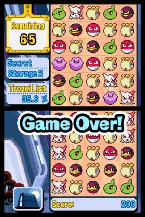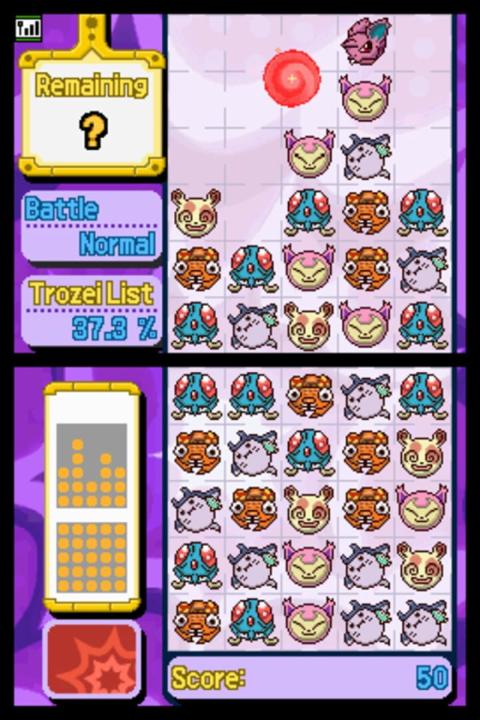 A crazy departure from your normal Pokémon game, Pokémon Trozei is a speedy puzzle game that will send your stylus flying! Your goal is to match the faces of four Pokémon in the game board to remove them, then string together more Pokémon faces to perform big combos. The Pokémon keep coming faster and faster, increasing the challenge the more you play. When you clear a set of Pokémon, that Pokémon will be added to your Pokédex, so look out for rare and special Pokémon to clear from the board! All of the 386 Pokémon available through Pokémon FireRed Version and Pokémon LeafGreen Version are in Pokémon Trozei, but it'll take a great many games to catch them all!