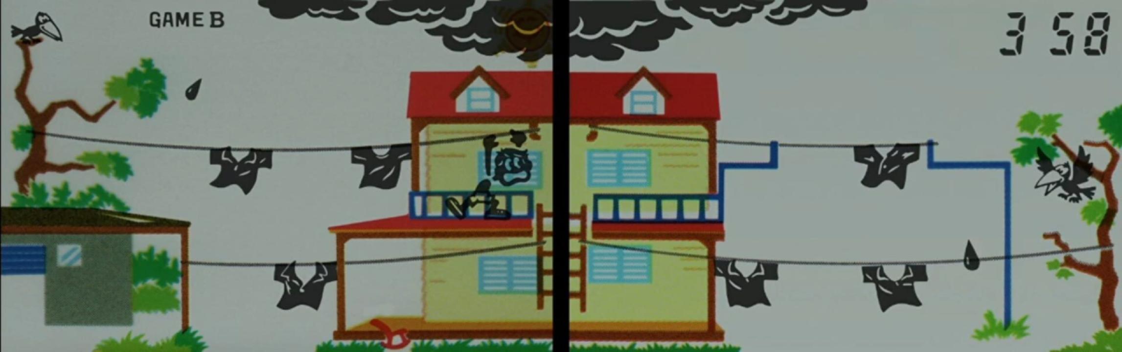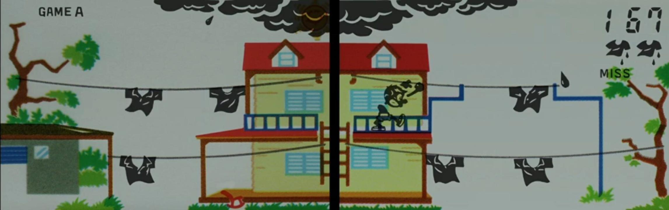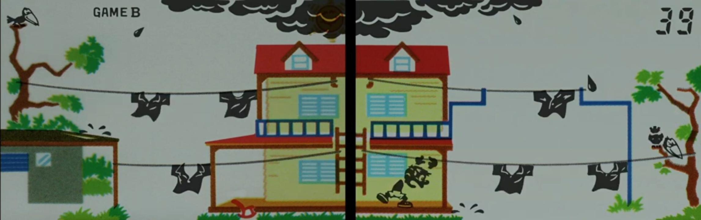 Rain Shower is a multiscreen Game & Watch video game released in 1983. It was released in 1983 and Nintendo reportedly made an estimated 250,000 units worldwide. In the game, your clothes are hanging up to dry outside, but it's about to rain, and you have to make sure your clothes don't get wet. The rain comes down in segments, so you can move the wire from left to right to make sure the segment of rain that's coming down don't get onto your clothes. In Game & Watch Gallery 4 for the Game Boy Advance the original game plus a new version that features Mario characters. There are two floors, with each floor having a clothes line on the left and the right. In the beginning of a game a cloud will generate over the character's house, and rain drops will start to fall. The character will then have to go up to the second floor and move the line so that the rain doesn't drop on the clothes. He'll then have to go to the main floor and change the positioning of the clothes down there until the water hits the ground.