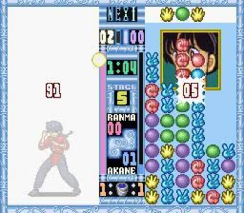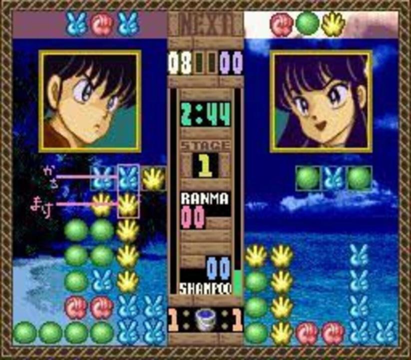 The game involves falling blocks of hands displaying the rock, paper, and scissors signs, which fall three at a time. In a similar manner to Tetris, the player can rotate the blocks to stack them, using pieces that defeat other pieces (e.g. paper over rock) to eliminate stacks. Doing so adds garbage pieces onto the opponent's screen to make it more difficult for them to eliminate their stacks of blocks. The objective is to fill up the opponent's screen up with blocks so that additional ones can no longer fit. Each character has two special attacks which can be used when large combinations are completed. Once in each round each player can also use a bucket of water that can transform a cursed character into their alternate form, which weakens their attacks until the effect wears off. This does not affect Akane or the Gambling King.