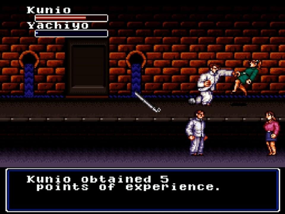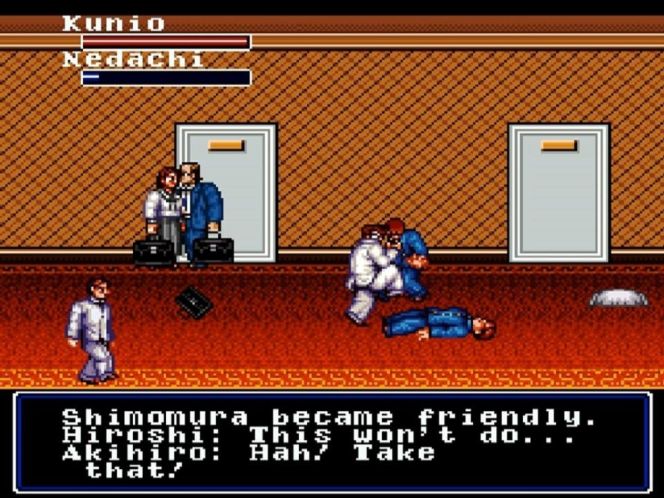 A student-only electric train has departed from Tokyo Station and has passed through Kyoto Station. A group of sophomore students from Nekketsu High School led by Kunio are aboard that train. Their destination is the city of laughter and defraud, Osaka. Kunio is sleepy and tired and that's when Hiroshi's voice wakes him up. "Kunio! Yoshihiro will guide us throught Osaka! Come with us!"(Yoshihiro is an exchange student who came from Osaka) Kunio has just learn that he is in Osaka.